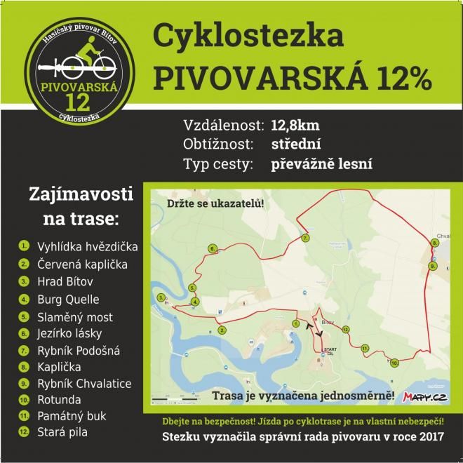TRASA: Hasičský pivovar Bítov > vyhlídka Hvězdička > hrad Bítov > Slaměný most > Jezírko lásky > U dubu > Chvalatice > zřícenina Rotunda Henrichsruhe > Hasičský pivovar Bítov.