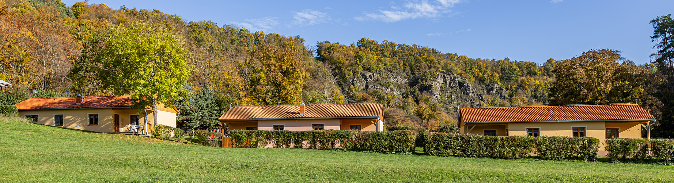 Chaty jsou umístěné v zatravněném, uzavřeném areálu, který poskytuje bezpečí, klid a dostatek prostoru pro děti i odpočinek.